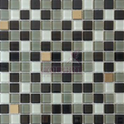 La sofisticación de esta pieza reside en su mezcla estratégica de materiales: una base de vidrio multicolor en grises y blanco que aporta profundidad y brillo, entrelazada con pequeños insertos de metales pulidos. Estos toques metálicos capturan la luz de forma sutil, rompiendo la sobriedad del blanco y negro con destellos tecnológicos. Es la opción ideal para un salpicadero de cocina moderno, un muro de acento en el baño o cualquier espacio que busque una textura arquitectónica definida y sofisticada.